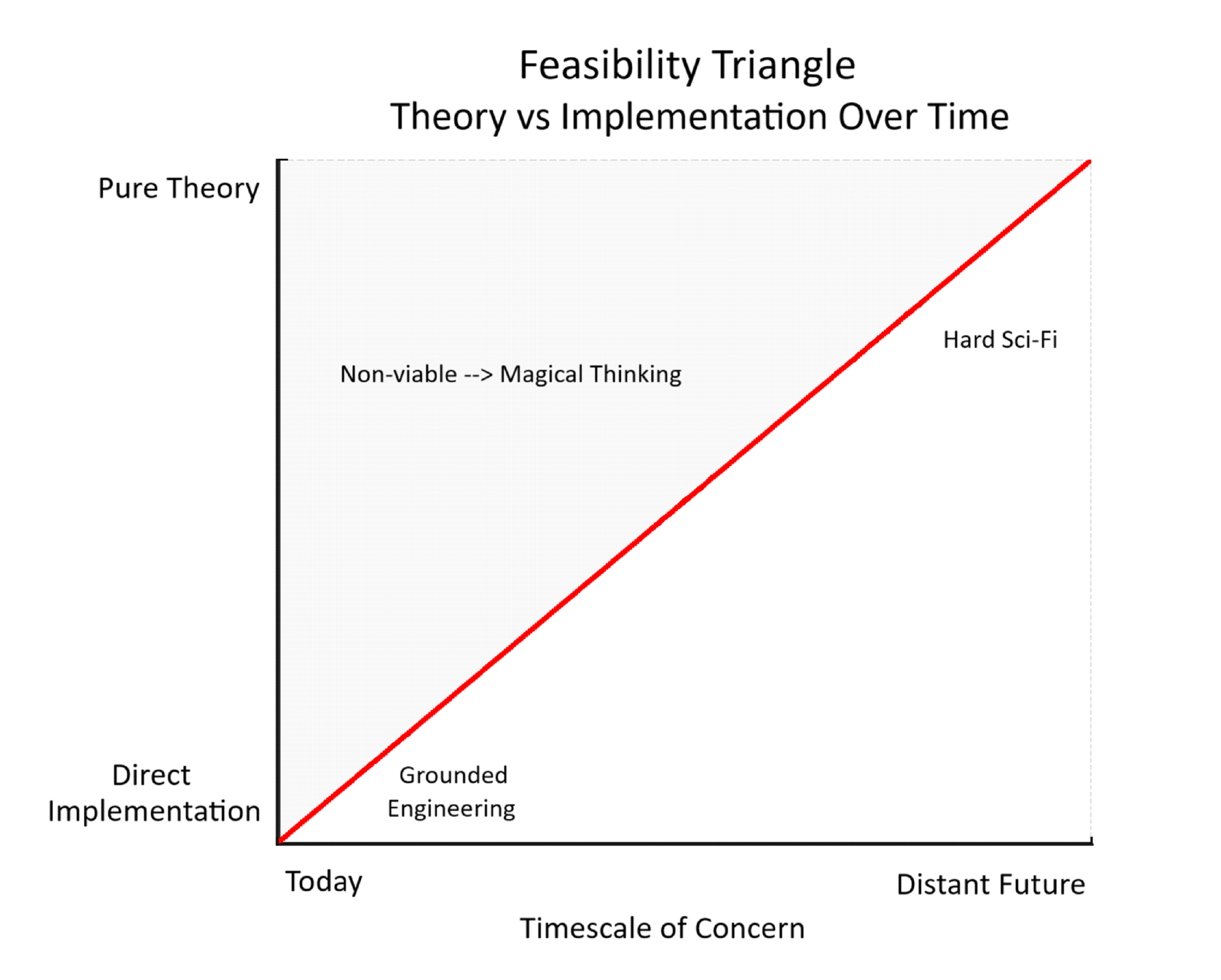 A two-axis map (Theory ↔ Implementation, Today ↔ Distant-Future) frames each proposal’s collapse path toward grounded delivery. The pilot occupies the mid-slope “realistic speculation” zone, anchored by a working transcript demo and clear TRL ladder.